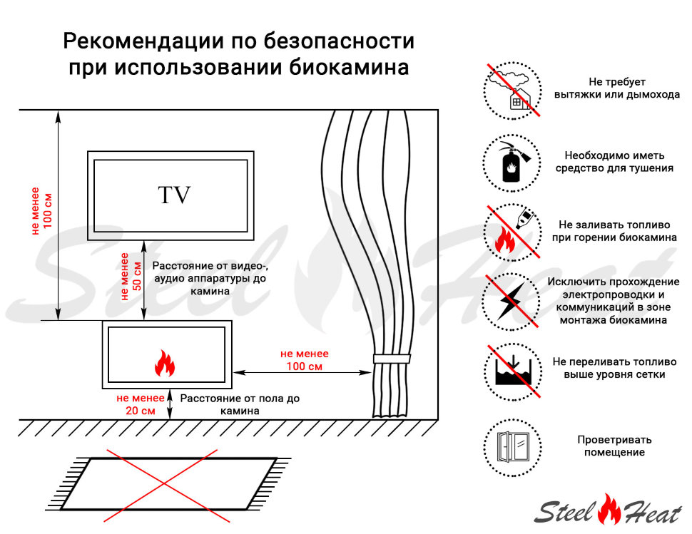 Биокамин рекомендуется устанавливать и использовать в закрытых помещениях с вентиляцией или открывающимися окнами для проветривания с относительной влажностью не более 55%.