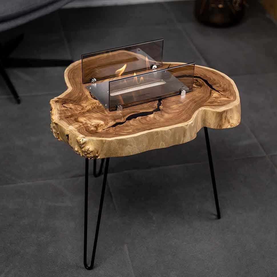 Легкость и небольшие размеры — свойства, которые позволяют совместить камин со столешницей из камня, МДФ, дерева, других материалов. Вероятность возгорания сведена к нулю — защитные огнеупорные накладки, разграничивающие нишу и корпус изделия, исключают нагрев стола.