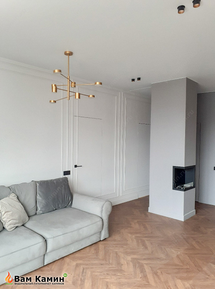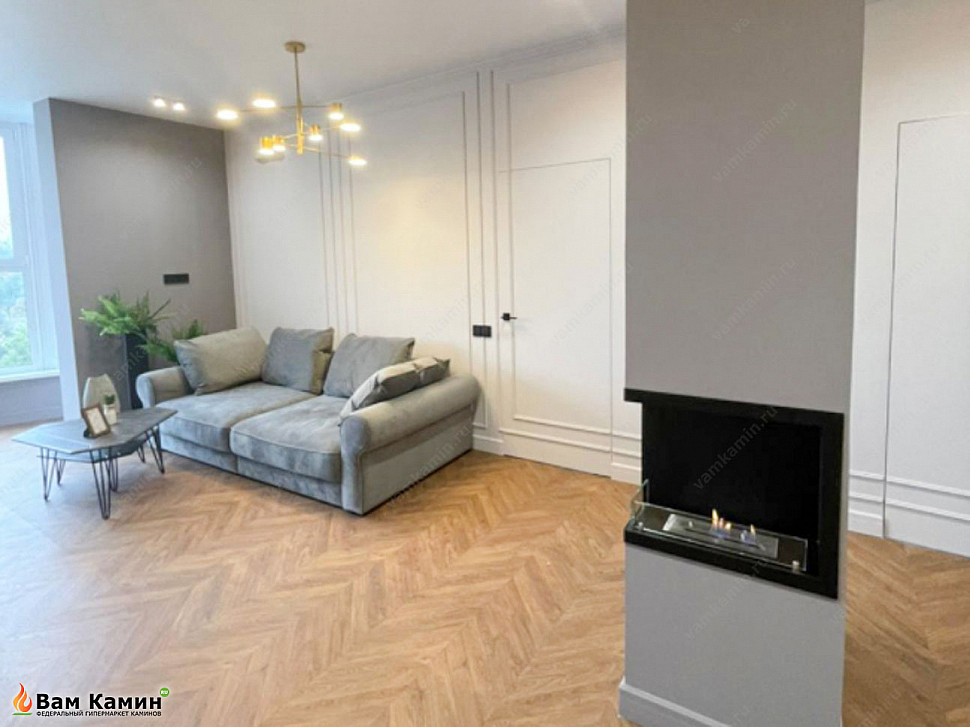 Биокамин угловой SteelHeat Leader 500 идеально подошел под готовую нишу в колонне комнаты. В итоге такой биокамин органично вписался в интерьер так, что создается впечатление будто он изначально там находился. Как видно на фото, с этим биокамином гостиная стала выглядеть еще уютнее. Линия огня в 210 мм позволяет хорошо обогревать комнату.