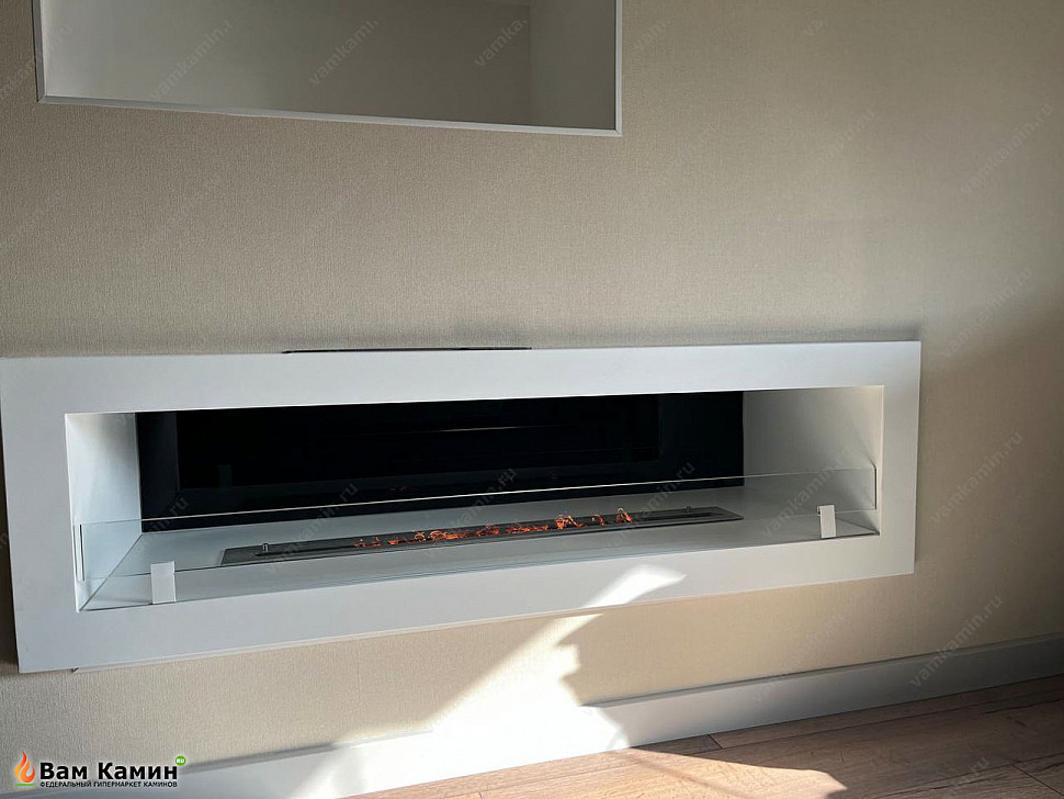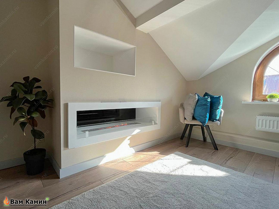 Биокамин в нишу SteelHeat ONE 1700 выступил здесь в качестве базовой модели. По желанию хозяев наши специалисты изготовили на его основе модель белого цвета, чтобы она гармонично сочеталась со светлыми тонами спальни. В результате биокамин идеально влился в окружающую обстановку и стал изюминкой всего дизайна помещения. Живое пламя очага смотрится аккуратно и изящно на белом фоне экокамина.