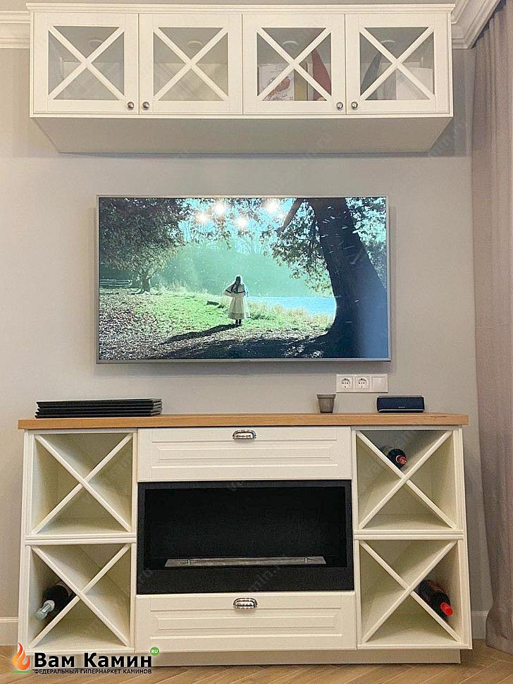 Одно из основных преимуществ биокаминов - компактные размеры дают возможность устанавливать их в стены, ниши и предметы мебели. В данном случае мы можем видеть экокамин, который встроили в красивую тумбу с винными полками. Тумба традиционно расположена под ТВ-экраном, поэтому можно с комфортом смотреть любимые фильмы в тепле и уюте. Такой биокамин создавался компанией SteelHeat на заказ по размерам клиента.